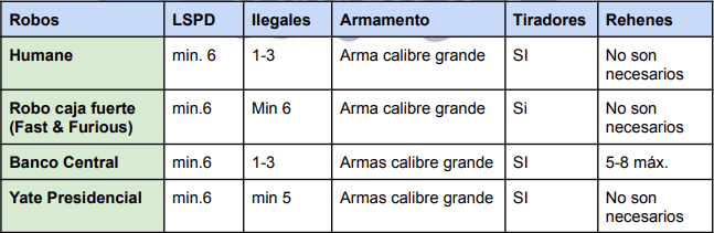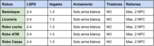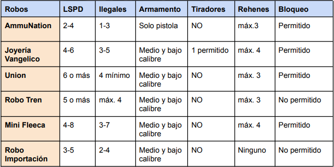 - Se permite hasta un máximo de 1 robos mayor por semana si perteneces a una organización criminal y siempre que tenga una argumentación/rol previo.